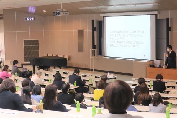 実習連絡会は学生の実習効果を上げるために実習先の園や施設の先生方と意見交換を行う場となっており、今年度は3年ぶりに対面(令和3年度はGoogleサイトによる動画配信)で、66園・施設の先生方にご参加いただきました。