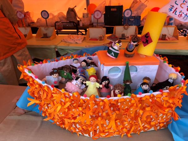 子どもたちがオレンジリボンを張り付けて船を飾ったり